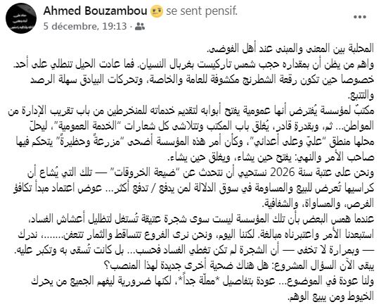 الموظف المطرود عبّر عن احتجاجه بلغة مجازية قائلاً إن المكتب “تحوّل إلى فضاء تتحكم فيه الفوضى، يُفتح ويُغلق بلا معايير واضحة”، مضيفًا أن “محاولة حجب شمس تاركيست بغربال النسيان لم تعد تنطلي على أحد”.
